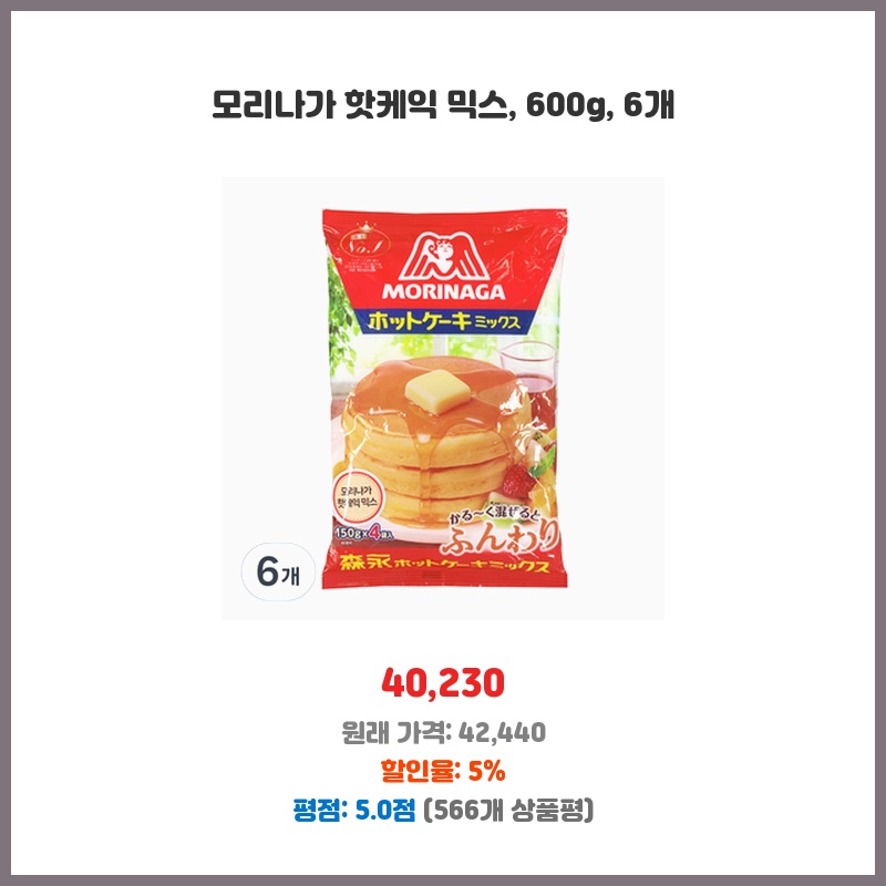 모리나가 핫케익 믹스는 맛있고 만드는 게 쉬워요! 플러피하고 부드러운 핫케익이 나와서 아침 식사에 완벽해요. 6개가 들어 있어 가족이나 친구와 공유하기에 충분해요.
