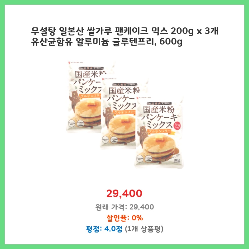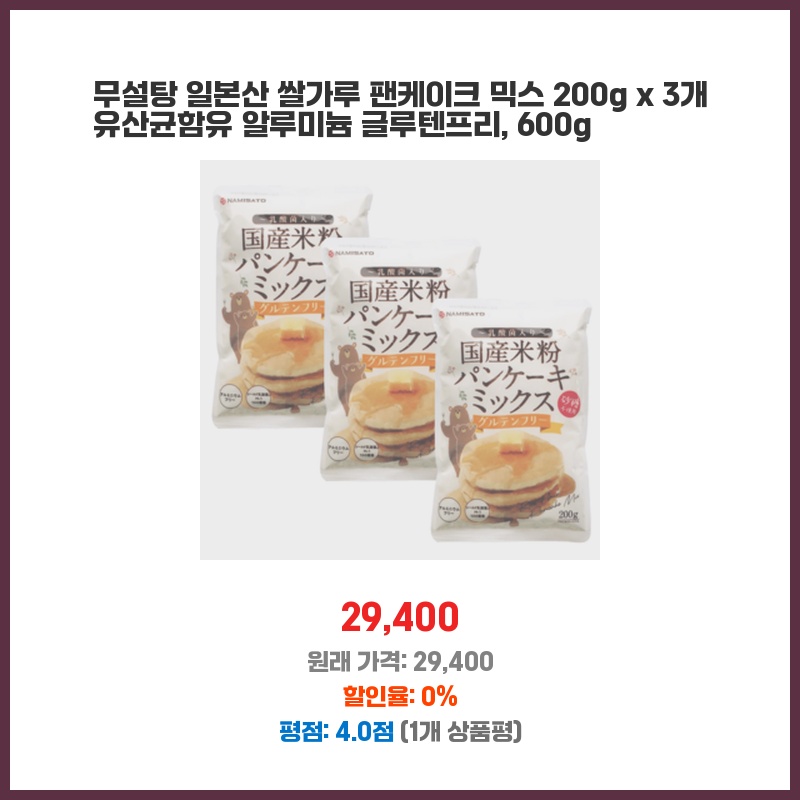 무설탕 일본산 쌀가루 팬케이크 믹스 200g x 3개 유산균함유 알루미늄 글루텐프리, 600g