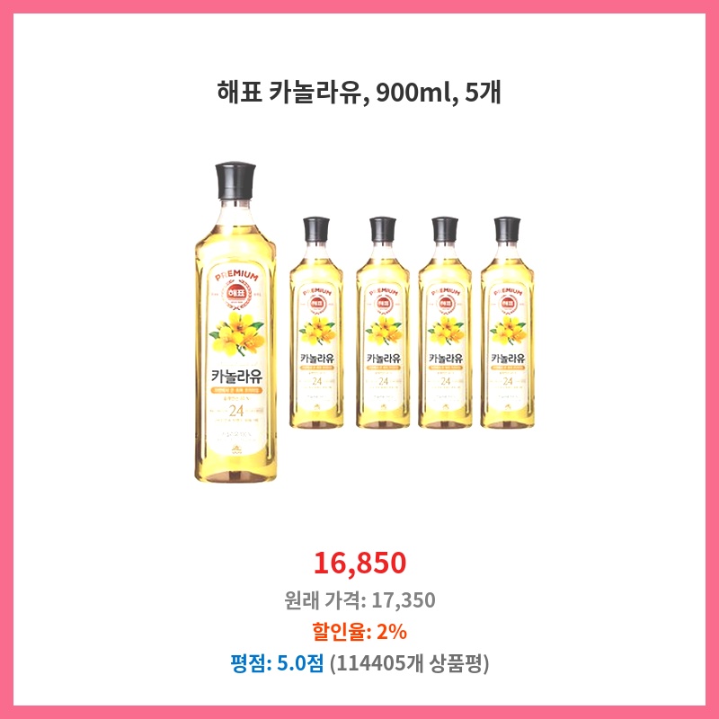 저는 해표 카놀라유를 건강한 요리에 사용하기 위해 구매했습니다. 이 오일은 심혈관 건강에 좋은 오메가-3 지방산이 풍부하고, 높은 발연점으로 튀김과 볶음 요리에 적합합니다. 또한, 900ml 용량 5개가 들어 있어 가격도 합리적이라 생각됩니다.