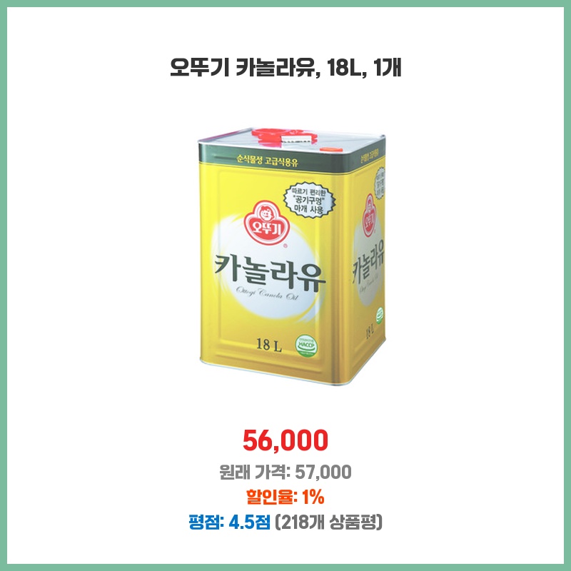 오뚜기 카놀라유는 18L 대용량으로 가족이 많거나 요리를 자주 하는 저에게 완벽합니다. 카놀라유는 심장 건강에 좋은 단일 불포화 지방이 풍부하고, 가벼운 맛으로 다양한 요리에 사용하기에 좋습니다. 또한, 오뚜기 브랜드는 신뢰할 수 있고 저렴한 가격으로 대량 구매에 적합합니다.