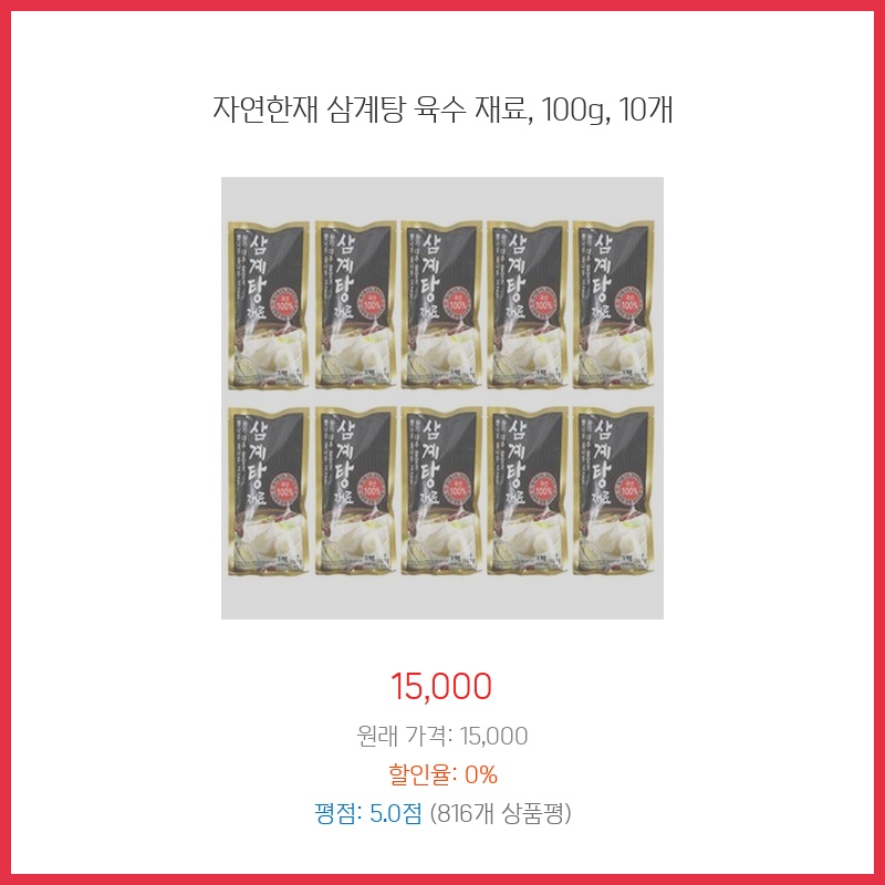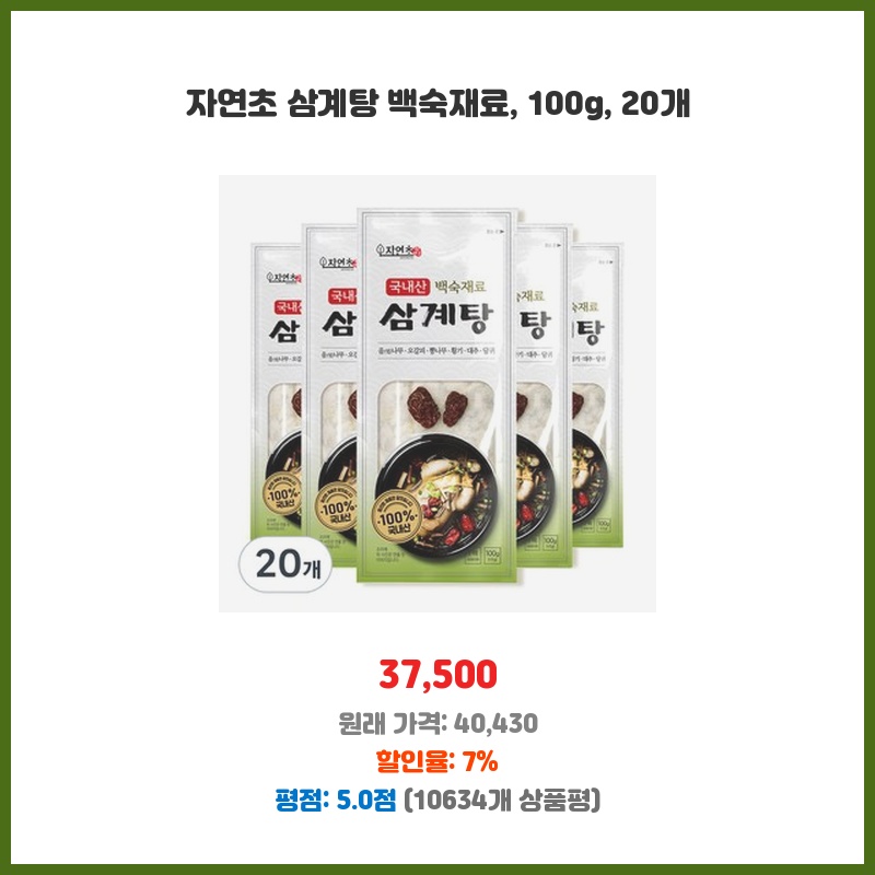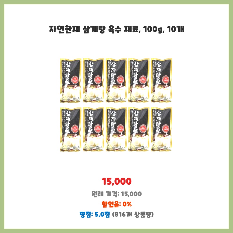 건강한 육수를 쉽고 편리하게 즐기고 싶어 이 제품을 구매했습니다. 100 천연 재료로 만들어졌고, 닭, 인삼, 대추 등 삼계탕에 필수적인 재료가 풍부하게 함유되어 있습니다. 또한, 조리 시간이 단축되어 바쁜 일상에서도 간편하게 삼계탕을 만들 수 있습니다.