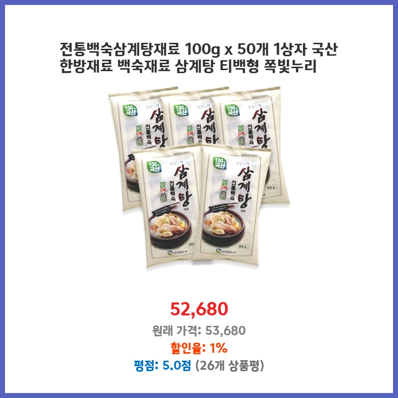 삼계탕이 간편하게 즐길 수 있어 좋았어요. 재료가 신선하고 풍부해서 맛있는 삼계탕을 만들 수 있었어요. 100g이므로 한 번에 적당한 양을 사용할 수 있어서 편리해요.