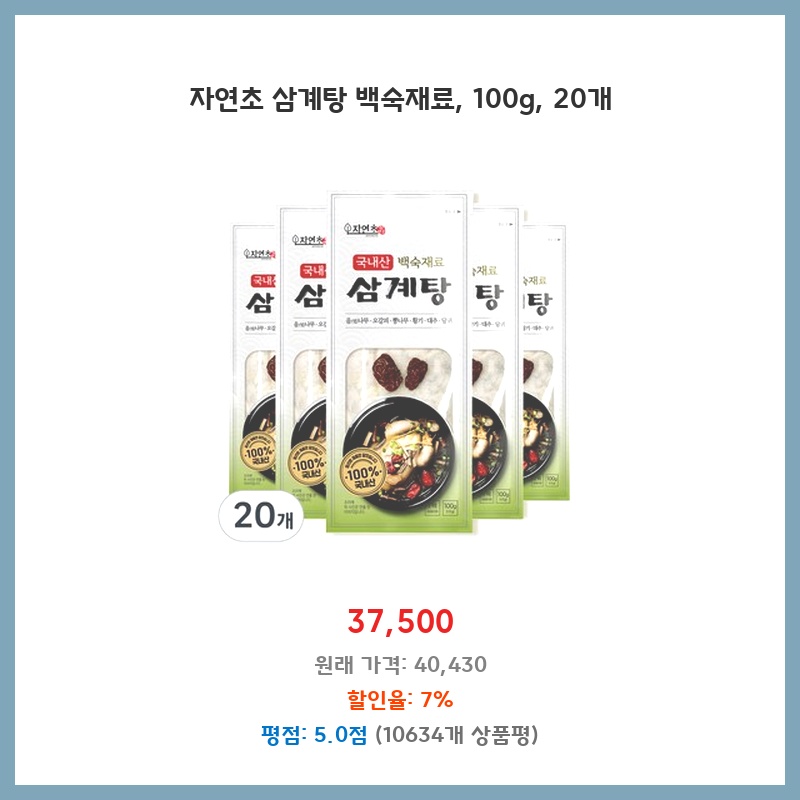집에서 맛있는 삼계탕을 쉽게 만들고 싶어서 이 제품을 구매했습니다. 자연초 재료로 만들어져 안심하고, 백숙재료가 미리 준비되어 있어 시간을 절약할 수 있습니다. 또한 20개가 들어 있어 가족이나 손님을 위해 여러 번 맛있는 삼계탕을 즐길 수 있어서 가성비가 좋습니다.