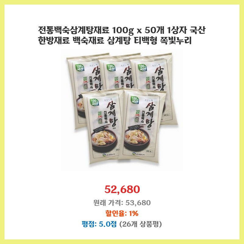 전통백숙삼계탕재료 100g x 50개 1상자 국산 한방재료 백숙재료 삼계탕 티백형 쪽빛누리