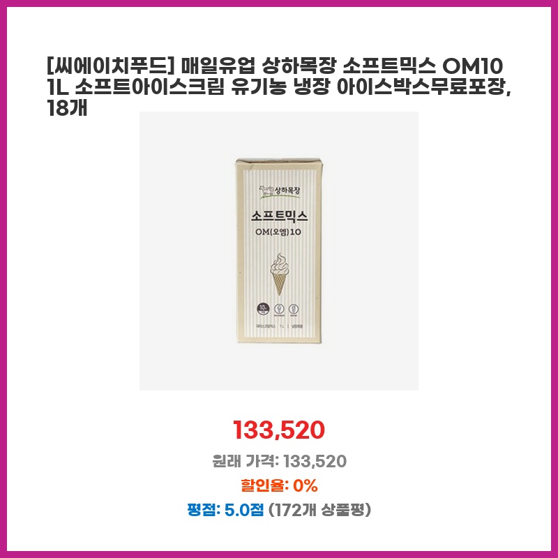 이 유기농 소프트믹스는 매일유업의 신선한 상하목장 우유로 만들어져 풍부한 맛과 부드러운 질감을 제공합니다. 1L 용량으로 12개가 포장되어 가족이나 친구들과 공유하기에 적합하며, 무료 냉장 아이스박스로 신선도를 유지할 수 있습니다. 유기농 재료로 만들어져 건강에 좋고, 90,120원의 가격으로 가성비도 뛰어납니다.