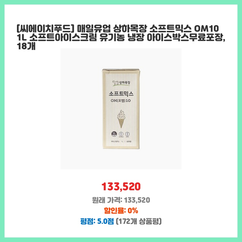 [씨에이치푸드] 매일유업 상하목장 소프트믹스 OM10 1L 소프트아이스크림 유기농 냉장 아이스박스무료포장, 18개