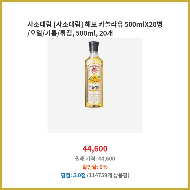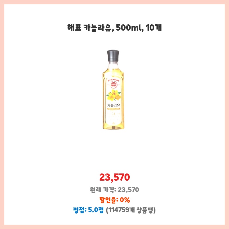 저는 가족의 건강을 생각해 해표 카놀라유를 구매했습니다. 이 제품은 심장 건강에 좋은 불포화 지방이 풍부하고, 요리에 사용하기 쉬운 중성적인 맛이 특징입니다. 또한 500ml 병 10개가 묶여 판매되어 가격 대비 가치가 높아서 저렴하게 대량으로 구매할 수 있습니다.