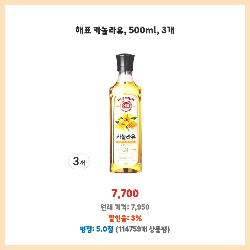 건강에 좋은 요리에 카놀라유를 사용하고 싶어서 해표 카놀라유를 구매했습니다. 카놀라유는 포화 지방이 적고, 오메가-3 지방산이 풍부하여 심혈관 건강에 도움이 된다고 알려져 있습니다. 또한 500ml 용량으로 가성비도 좋습니다.