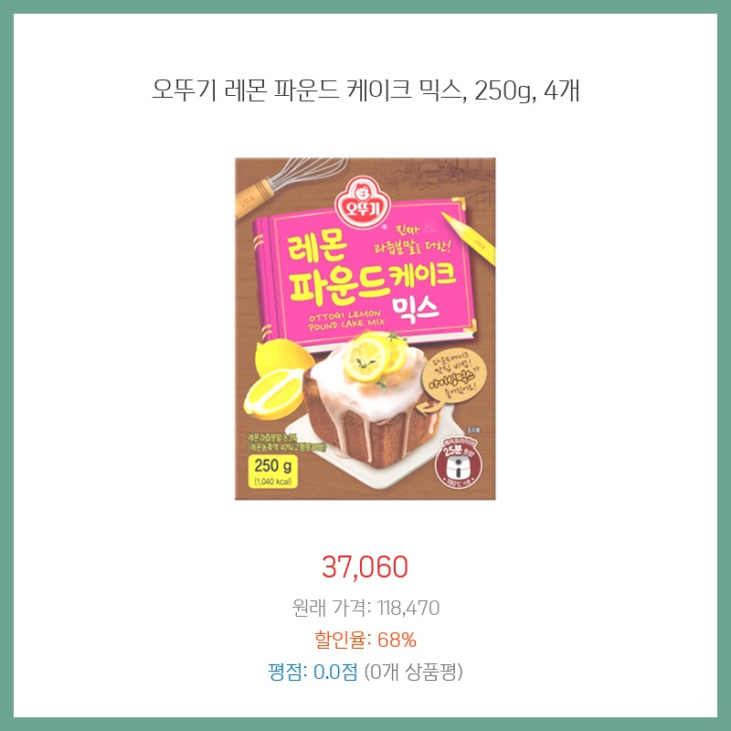 집에서 간편하게 레몬 파운드 케이크를 만들고 싶어서 구매했습니다. 믹스 제품이라 재료 준비가 간편하고, 오뚜기 제품이라 믿을 수 있었어요. 4개들이라 나눠서 사용하기에도 좋습니다.