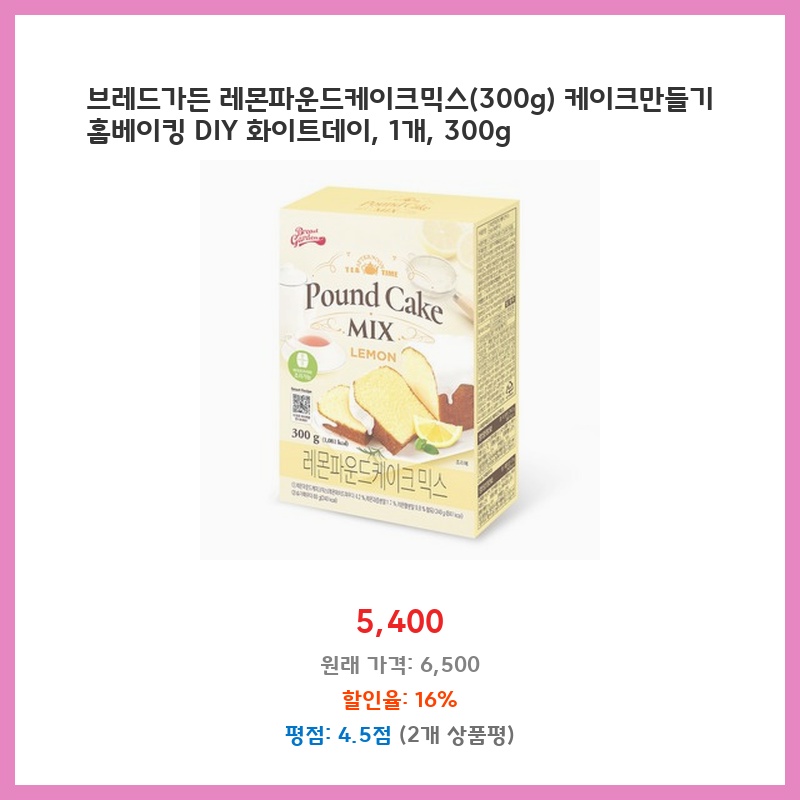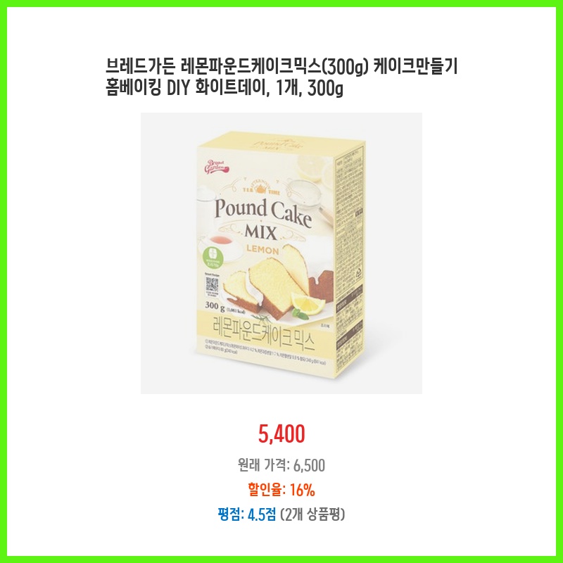 레몬 향을 좋아하고 베이킹은 하고 싶지만 시간이 부족해서 믹스 제품을 찾았습니다. 브레드가든 제품은 후기가 좋아서 선택했고, 300g 용량으로 1인분 만들기에 적당해 보였습니다. 레몬 파운드 케이크를 간편하게 만들 수 있다는 점이 가장 큰 장점입니다.