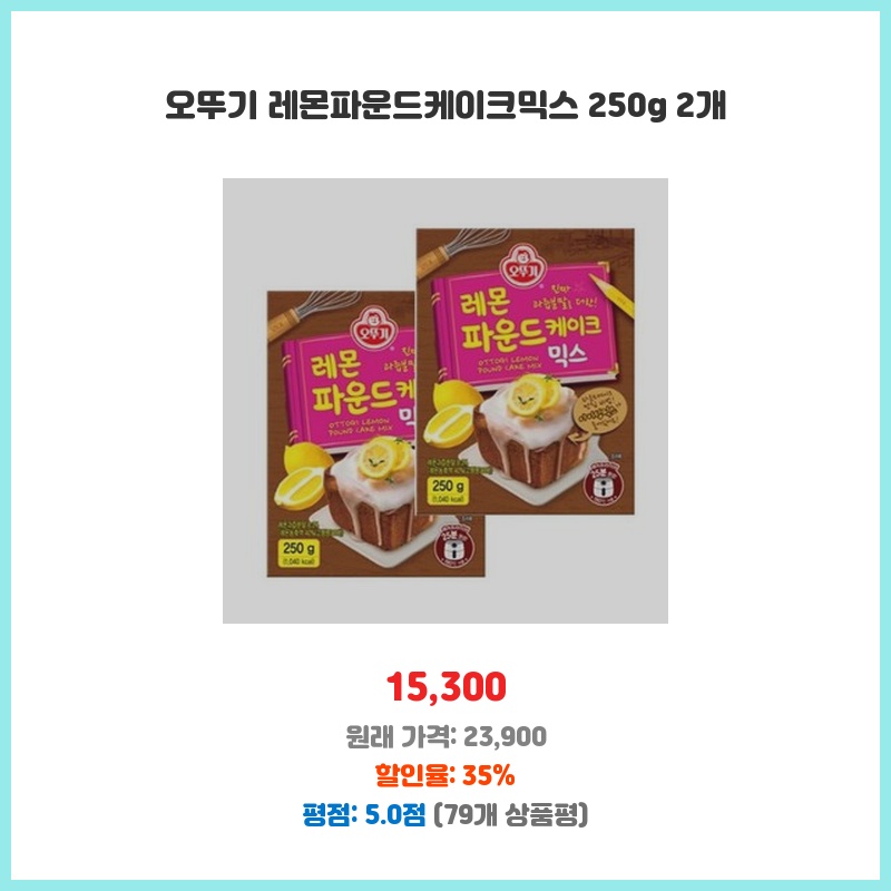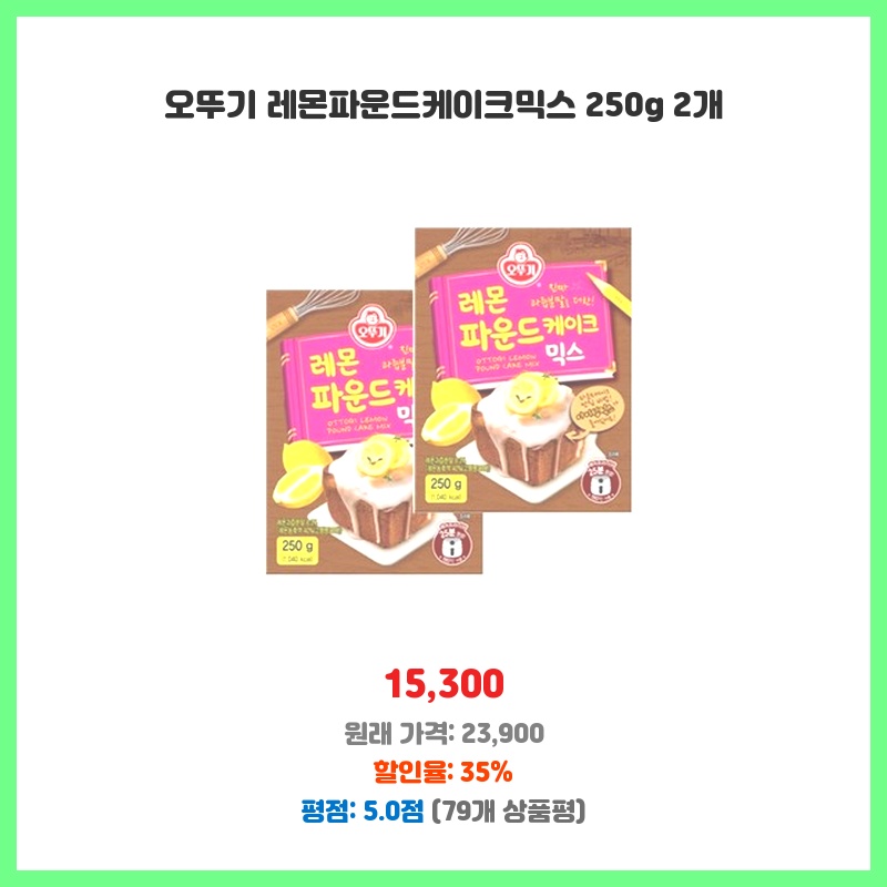 간편하게 레몬 파운드케이크를 만들고 싶어서 구매했습니다. 믹스 제품이라 재료 준비가 간편하고, 오뚜기 제품이라 믿을 수 있었어요. 2개들이라 넉넉하게 먹을 수 있는 점도 좋았습니다.