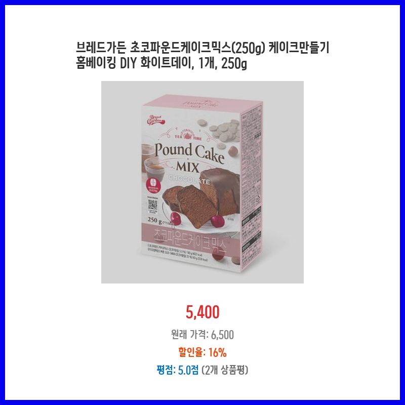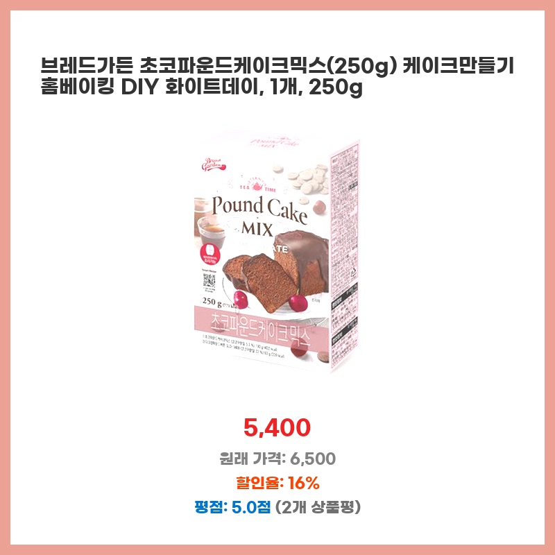 홈베이킹을 좋아해서 다양한 믹스를 사용해보고 싶었어요. 브레드가든 제품이 믿을 수 있는 브랜드라 선택했고, 초코파운드케이크는 실패 확률이 적어 초보 베이커에게도 좋을 것 같았습니다. 250g 용량도 혼자 먹기에 적당한 양이라 좋네요.