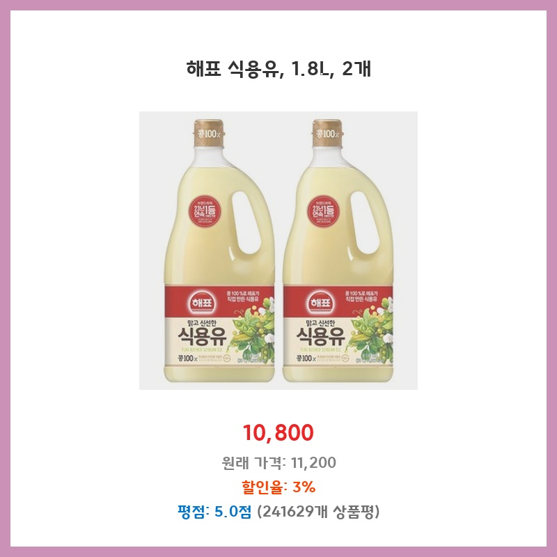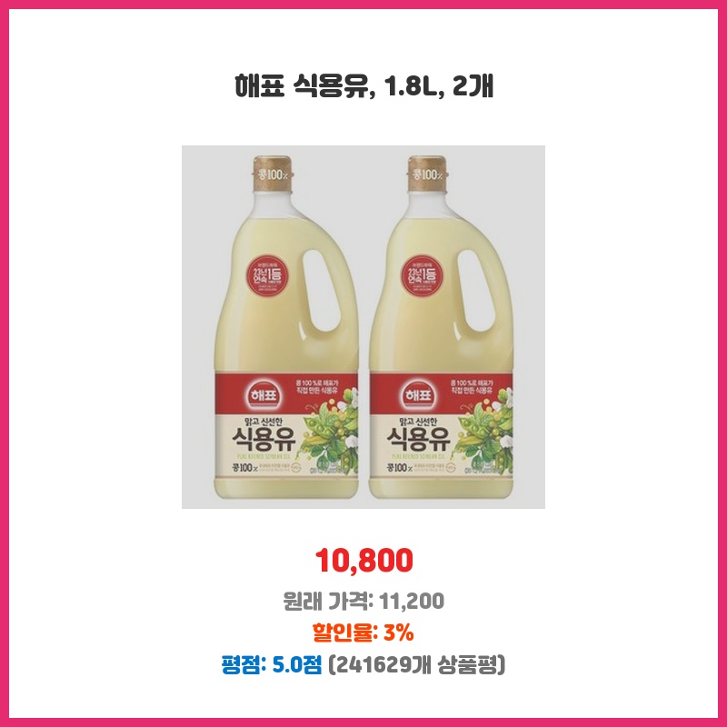 튀김요리 많이 해먹는데 해표 식용유 깔끔하고 발연점 높아서 좋음. 1.8L 대용량 두 개 묶음으로 사면 더 저렴해서 구매. 항상 쓰던 제품이라 믿고 씀.