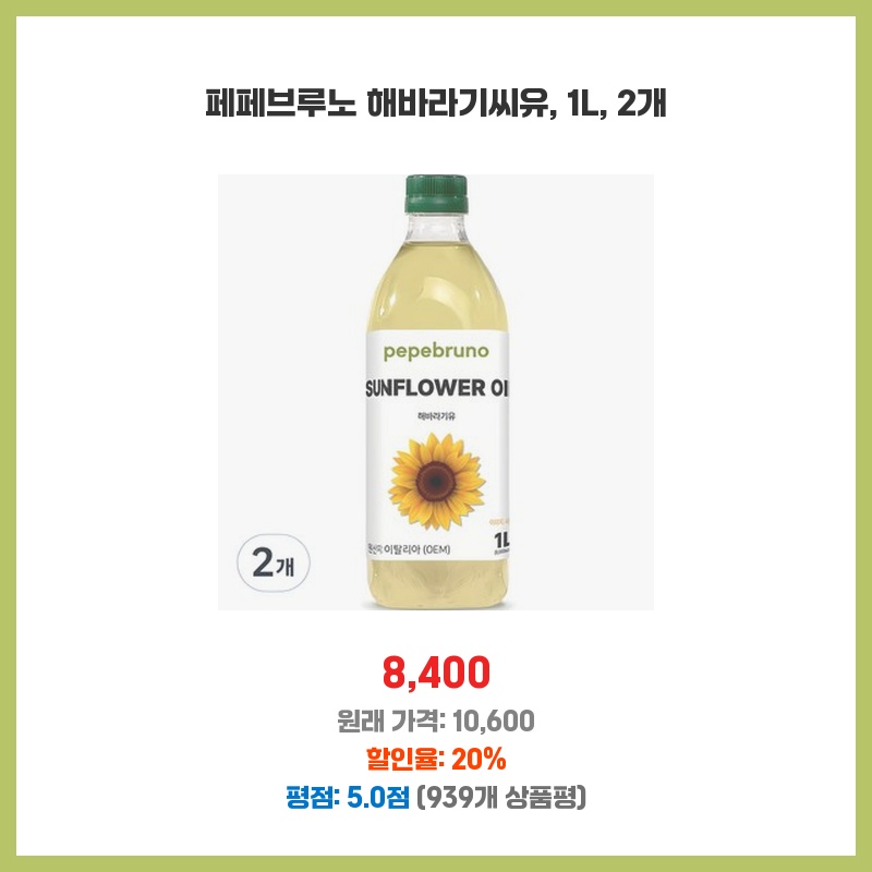 페페브루노 해바라기씨유는 발연점이 높아 튀김 요리에 적합하고, 맛도 깔끔해서 자주 사용합니다. 1L 두 개 묶음 상품이라 가격도 저렴해서 재구매했어요.