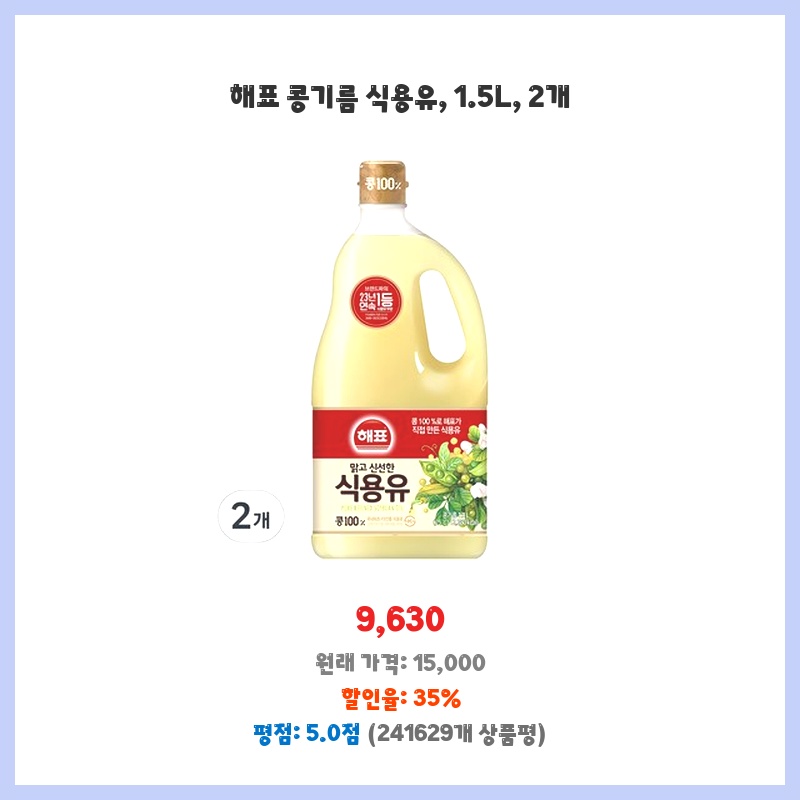 콩기름은 발연점이 높아 튀김 요리에 적합하고, 해표는 믿을 수 있는 브랜드라 늘 사용합니다. 1.5L 두 개 묶음 상품이라 가성비도 좋아 구매했습니다.