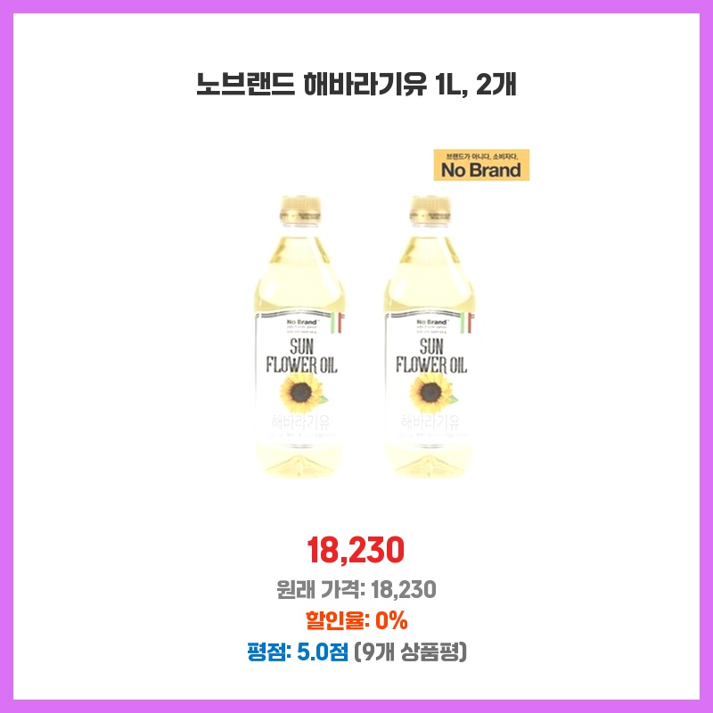 가성비 최고! 노브랜드 해바라기유 두 개 샀는데 튀김요리도 깔끔하고 좋네요. 양도 넉넉해서 오래 쓸 듯! 만족합니다.